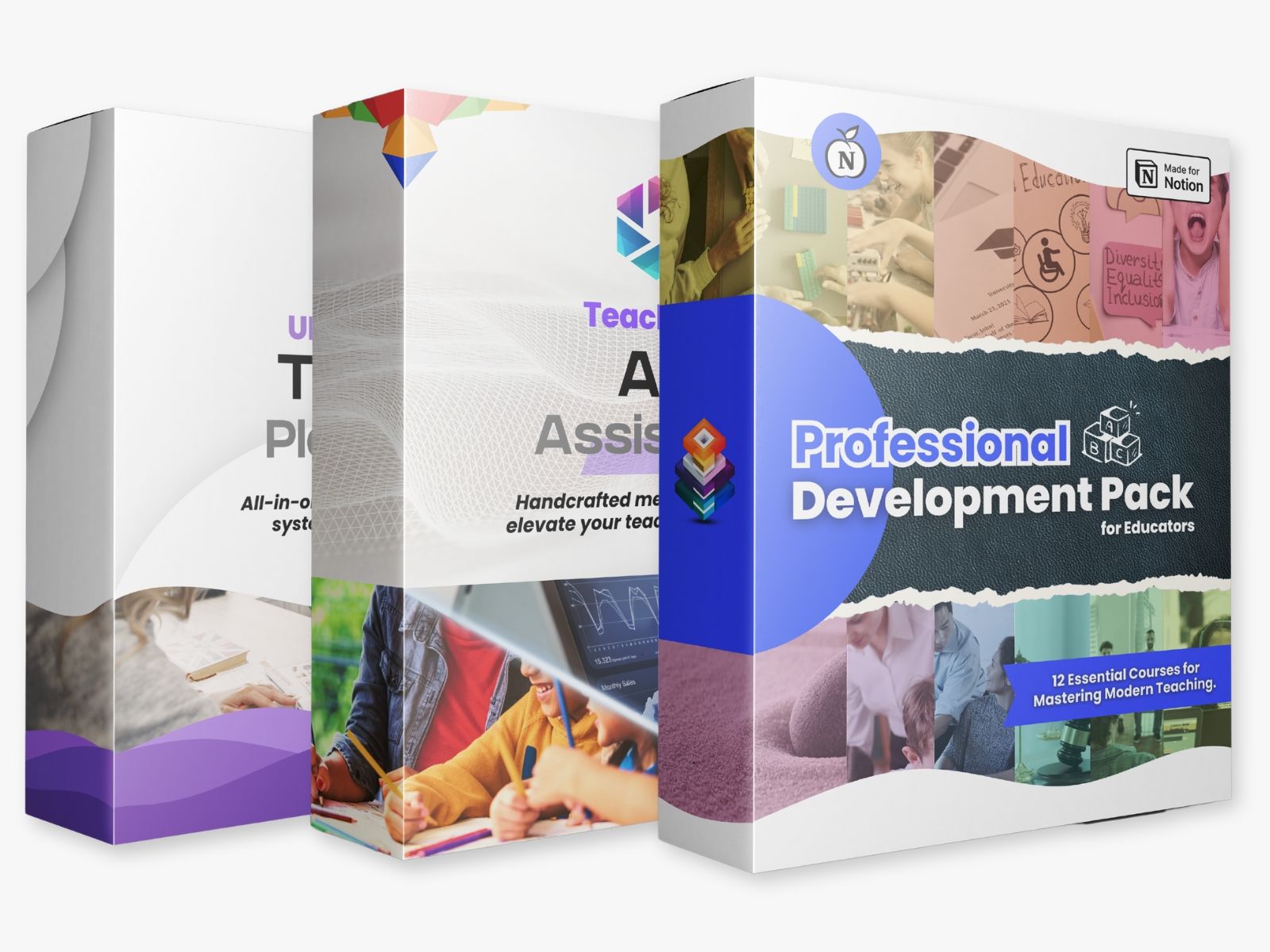 The Complete Teacher Bundle is the complete Notion for Teachers package. This bundle features three power-packed templates: The Ultimate Teacher Planner, the Teacher's AI Assistant, and the Professional Development Pack for Educators.