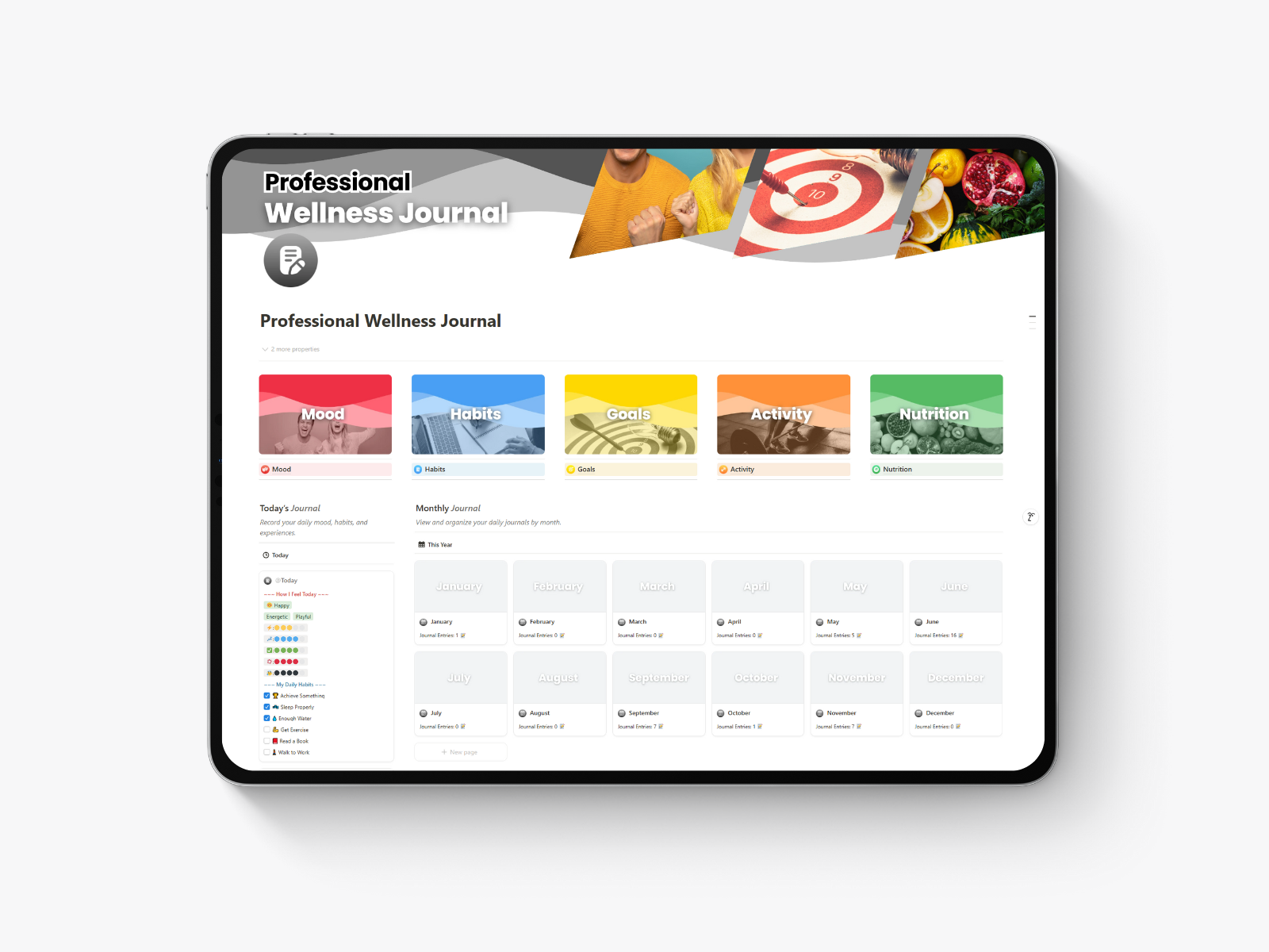 The Professional Wellness Journal is a complete personal growth system designed to help you build better habits and create lasting change. This Notion template combines daily journaling, habit tracking, mood monitoring, goal setting, workout planning, and nutrition tracking in one organized space. Replace your scattered apps and notebooks with a single system that helps you stay consistent and see real progress.