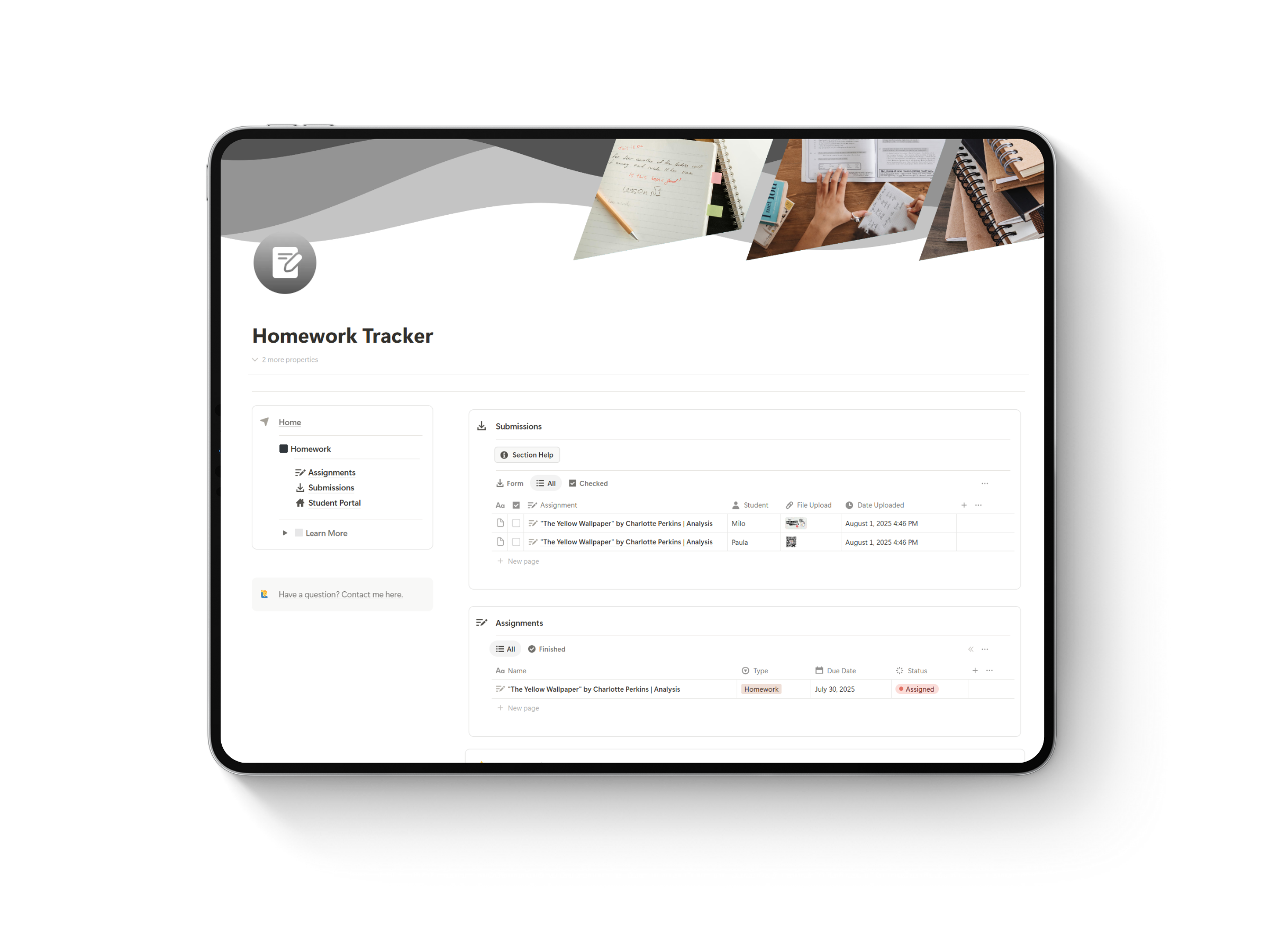A simple, student-friendly Notion system for managing classwork, assignments, and homework submissions. Teachers can create and share assignments through a public Student Portal — similar to Google Classroom — where students can submit their work without needing an email. Submissions are automatically organized, making it easy for teachers to review and track progress all in one place. 📄 Post assignments and classwork in one place🚫 No student emails or sign-ins needed✅ Easily track and review submissions🔗 Works like Google Classroom, but inside your Notion workspace🗂 Keeps all student work centralized and organized