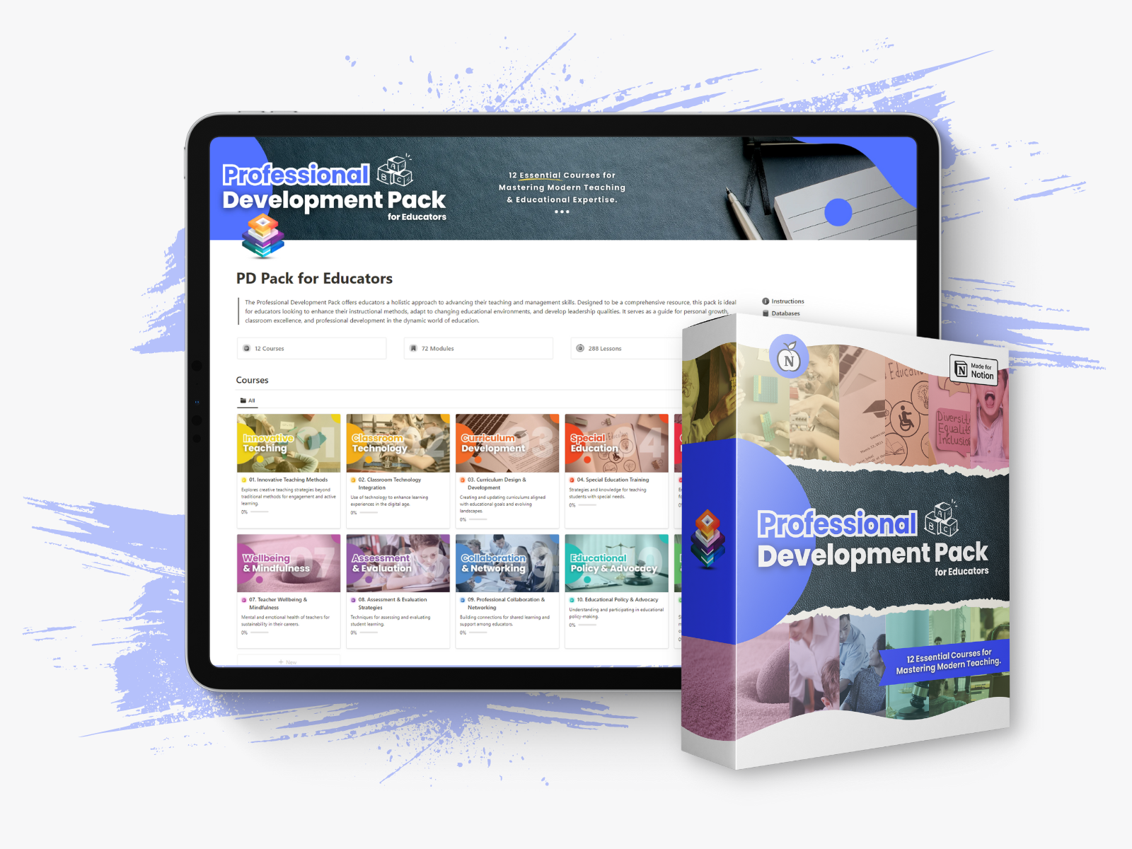 The Professional Development Pack for Educators is a comprehensive Notion template designed to elevate the skills and knowledge of teachers in various essential areas of education. This pack encompasses 12 in-depth courses, each targeting specific facets of professional development in the education sector.