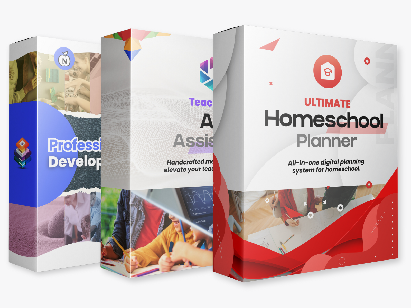 The Complete Homeschool Bundle is the complete Notion for Homeschooling package. This bundle features three power-packed templates: The Ultimate Homeschool Planner, the Teacher's AI Assistant, and the Professional Development Pack for Educators.
